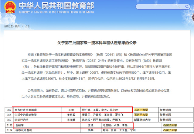近日,教育部高等教育司正式公示第三批国家级一流本科课程认定结果,我院申报的《西方经济学面面观》与《金融学》两门课程成功入选,标志着我院在一流本科课程建设再次取得重大突破。
