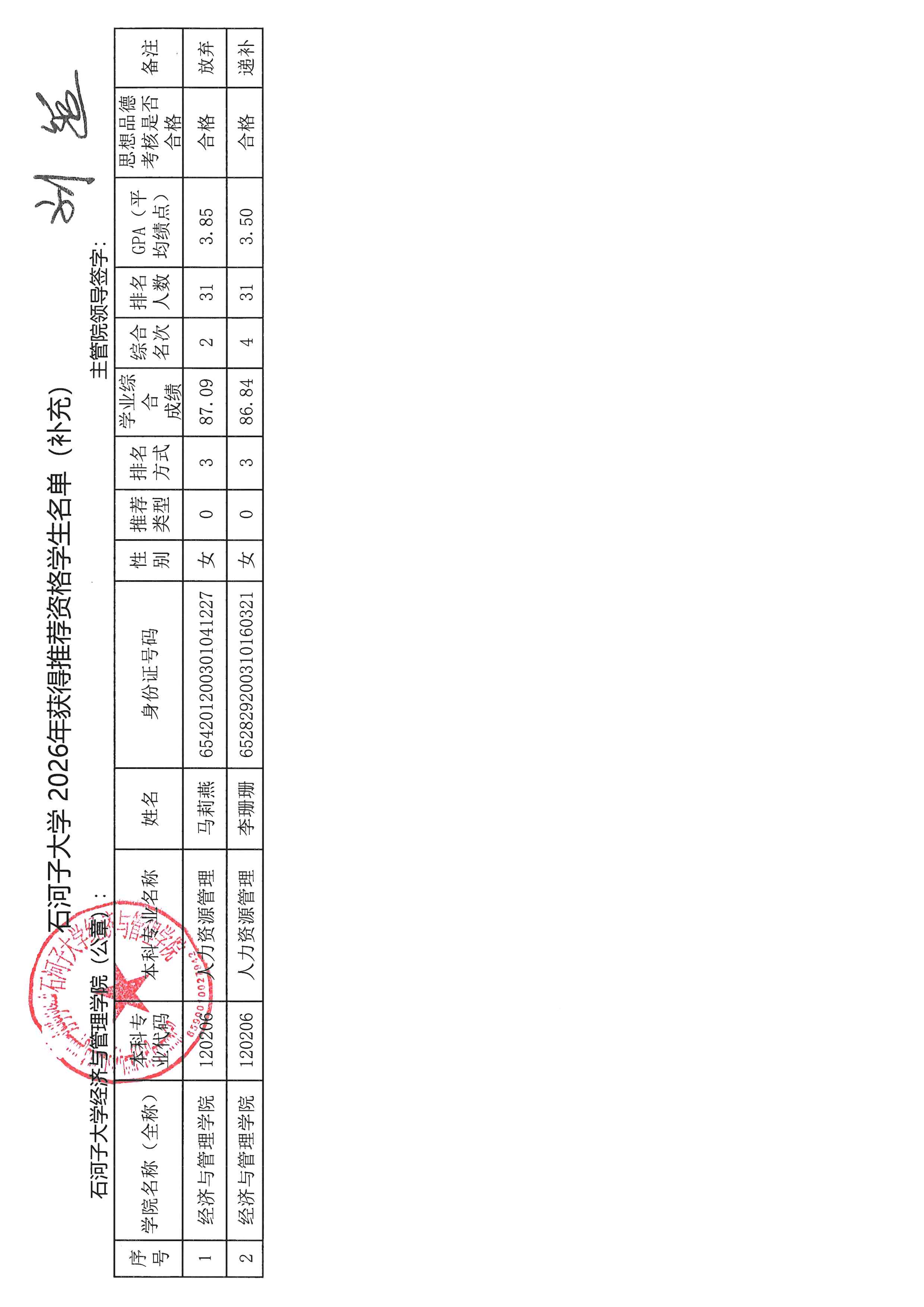 根据《教育部办公厅关于进一步规范和加强推荐优秀应届本科毕业生免试攻读研究生工作的通知》(教学厅〔2020〕12号)、《石河子大学2026年推荐优秀应届本科毕业生免试攻读研究生实施办法》和《石河子大学经济与管理学院2026年推荐优秀应届本科毕业生免试攻读研究生实施细则》的有关规定,因人力资源管理专业1名推免生自愿放弃推免资格,现按照专业综合成绩排名递补1名推免生,并按照工作要求予以公示,公示期:2025年9月18日-2025年9月21日。