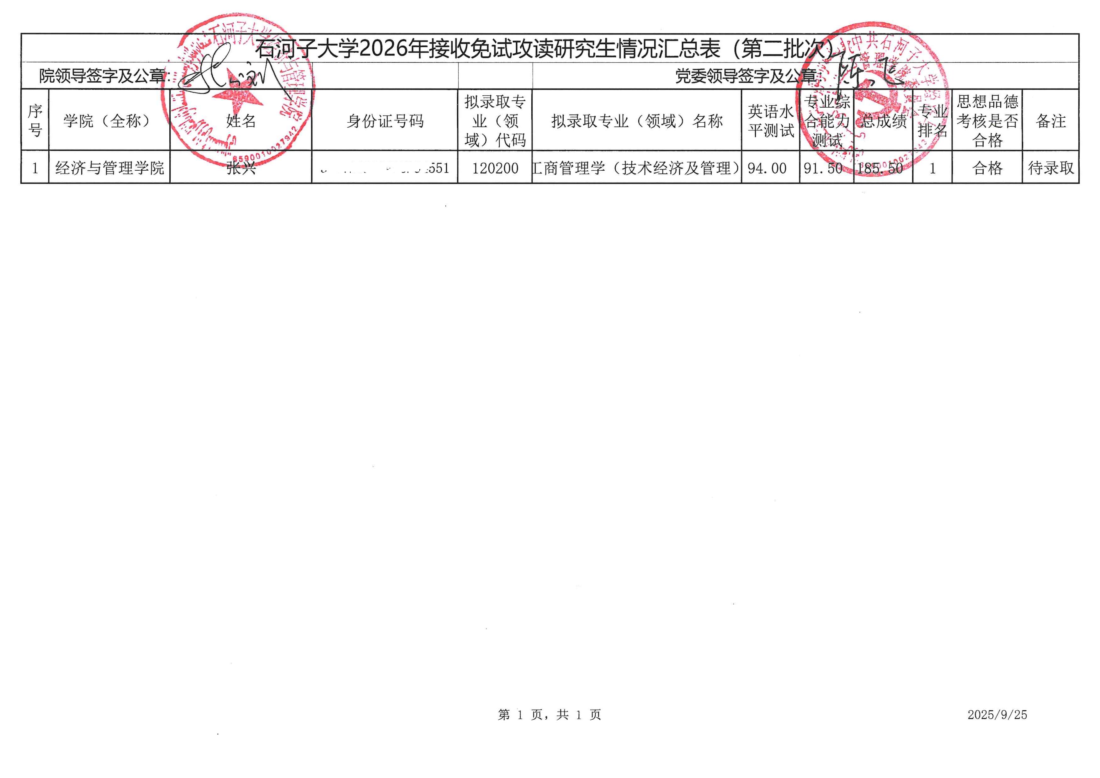 根据《教育部办公厅关于进一步规范和加强推荐优秀应届本科毕业生免试攻读研究生工作的通知》(教学厅〔2020〕12号)、《石河子大学2026年接收优秀应届本科毕业生免试攻读研究生(含直博生)章程》和《石河子大学经济与管理学院推荐优秀应届本科毕业生免试攻读研究生实施细则》的有关规定,现将石河子大学经济与管理学院2026年接收推免生复试情况(第二批次)进行公示,公示期:2025年9月28日-2025年9月30日。