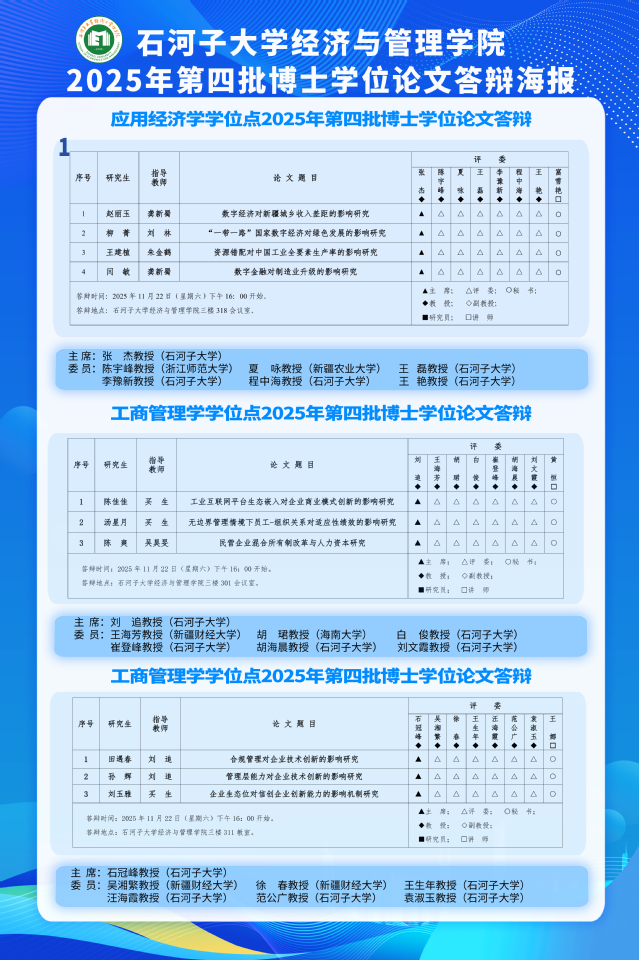 石河子大学经济与管理学院2025年第四批博士毕业答辩安排