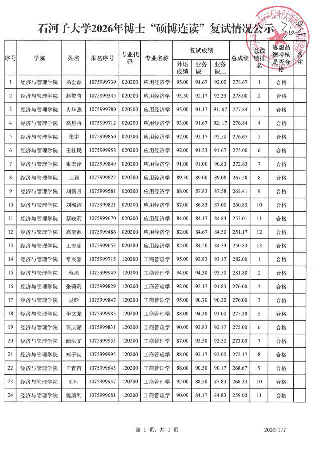 依据《石河子大学经济与管理学院2026年博士研究生招生工作细则》,石河子大学经济与管理学院于2026年1月5日组织了硕博连读考生面试工作,现将面试成绩予以公示,我院将根据学科方向招生指标,按总成绩排名依次递补录取。具体拟录取情况以大学官网公布结果为准。