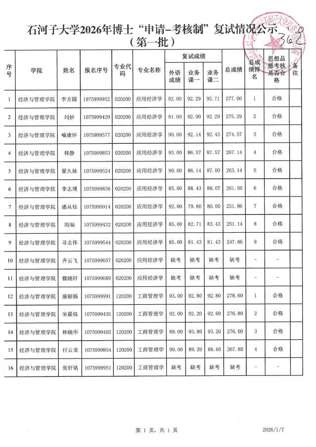 依据《石河子大学经济与管理学院2026年博士研究生招生工作细则》,石河子大学经济与管理学院于2026年1月6日组织了第一批“申请-考核制”考生面试工作,现将面试成绩予以公示,我院将根据学科方向招生指标,按总成绩排名依次递补录取。具体拟录取情况以大学公布结果为准。