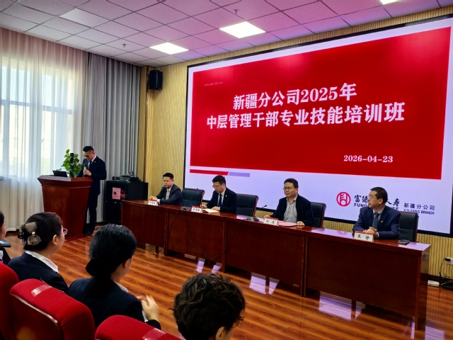 2026年4月23日,由富德生命人寿新疆分公司主办、石河子大学经济与管理学院承办的“富德生命人寿新疆分公司2025年中层管理干部专业技能培训班”,在石河子大学北区学术交流中心三楼学术报告厅正式开班。富德生命人寿新疆分公司总经理王利新、总经理助理何儒生、焦静出席开班仪式,石河子大学经济与管理学院副院长刘追教授出席并致欢迎辞。
